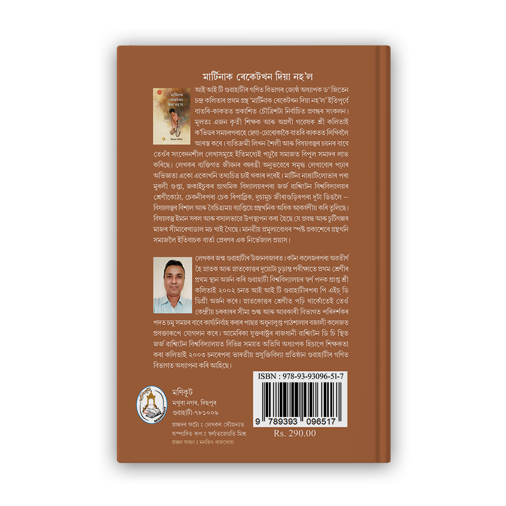 The first book by Dr. Jiten Chandra Kalita, Senior Professor in the Department of Mathematics at IIT Guwahati, Martinak Racket Khon Diya Nohol, is a collection of thirty-four selected essays previously published in newspapers. Shri Kalita—a distinguished teacher and pioneering researcher—began writing for newspapers only during the COVID period, almost quietly and unassumingly. His sensitive writings, marked by a unique style and an unusual choice of subjects, have already won wide admiration among readers. Enriched with the multicoloured experiences of the author’s personal life, reading these essays feels like watching a series of documentaries.